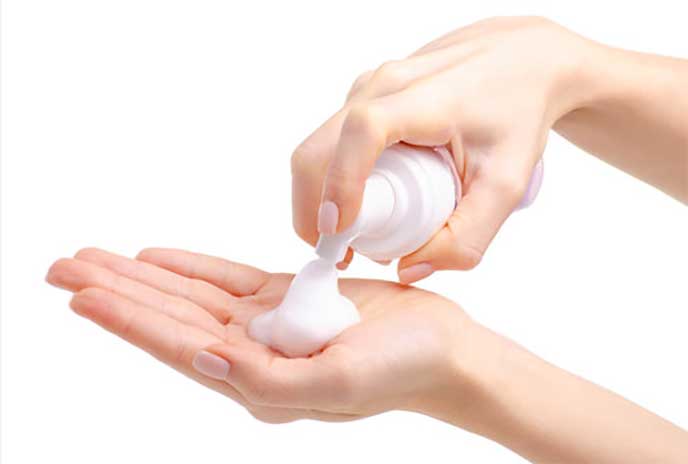 مقدار مناسب فوم: یک مقدار مناسب از فوم را روی دست خود بریزید. معمولاً یکبار فشار بر پمپ فوم کافیست. اگر فوم را با دست تهیه میکنید، با چرخش دستها به هم آغاز کنید تا حبابهای فومی تولید شود.