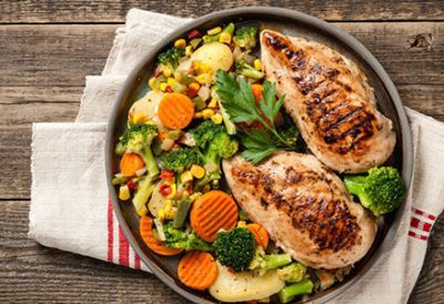 شام؛ سالمون کبابی با لیمو و سبزیجات سبز بخارپز.